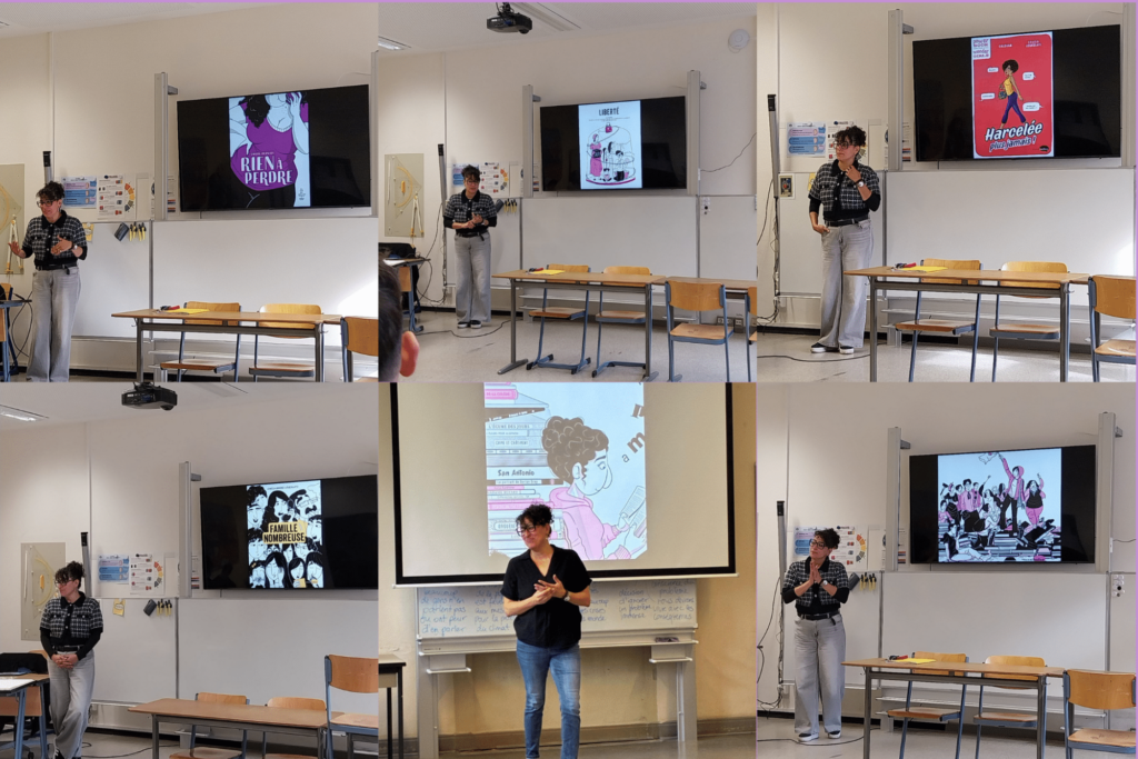 Die Schüler: innen erhielten die besondere Gelegenheit, Loueslatis Geschichten direkt von ihr selbst zu hören – mit viel Humor erzählte sie von ihrer Familie, ihren zehn Geschwistern und der oft strengen Erziehung, die sie prägte. In ihren Graphic Novels «Famille nombreuse», «Nos vacances au bled» und «Liberté, Egalité, s’émanciper» verarbeitet sie diese Erlebnisse sowie die Migration ihrer Eltern, die 1960 aus Tunesien nach Frankreich auswanderten. Beide Workshops fanden vollständig auf Französisch statt und boten den Schüler:innen zugleich einen lebendigen deutsch-französischen Austausch und die Möglichkeit, ihre Sprachkenntnisse zu vertiefen.